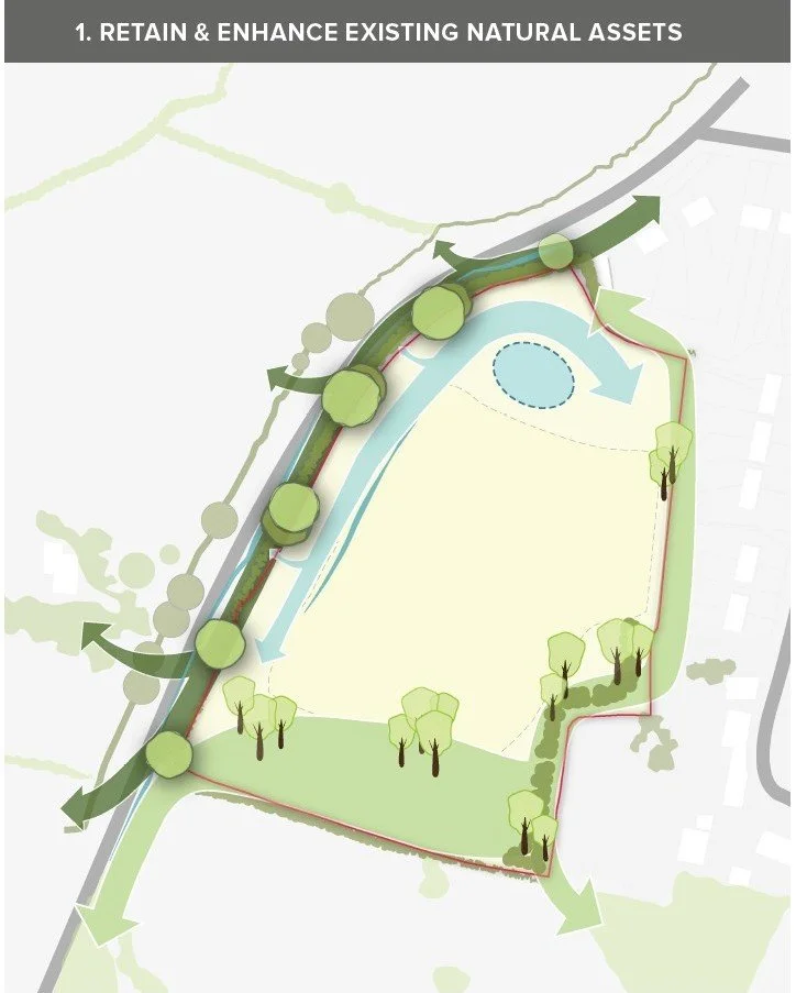 Existing hedgerow and trees will be retained, enhanced and celebrated within a new multi-functional mosaic of green infrastructure. Grassland and tree planting and proposed drainage features will provide new wildlife corridors, as well as strengthening existing linkages throughout the development to create a connected habitat mosaic and promoting a healthy nature recovery network that provides a biodiversity net gain.